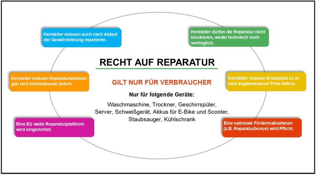 Geregelt wurde auch, dass Kundinnen und Kunden künftig viele Jahre nach dem Kauf zum Beispiel einer Waschmaschine vom Hersteller eine Reparatur verlangen können, auch wenn die Gewährleistungsfrist bereits abgelaufen ist, es sei denn, die Reparatur ist unmöglich.