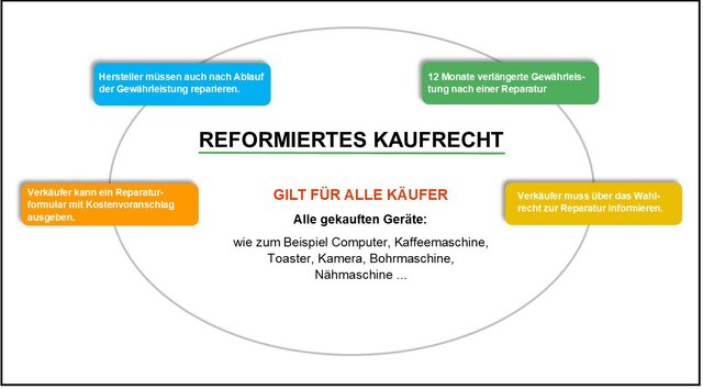 Des Weiteren möchte die EU eine Reparatur-Plattform einrichten, die den Kunden den schnellsten Weg zu Reparaturwerkstätten, Repair-Cafés und Verkäufern überholter Waren in ihrer Nähe zeigt. Alle Mitgliedsstaaten sollen außerdem mindestens eine nationale Fördermaßnahme, etwa einen Reparaturbonus, einführen. Auch die EU-Warenkauf-Richtlinie wurde reformiert: Zukünftig erhält jeder, der ein Elektrogerät reparieren lässt, zusätzlich 12 Monate Gewährleistung. Gewährleistung bedeutet, dass der Verkäufer bei Mängeln haftet und gegebenenfalls Rückerstattung oder Preisminderung schuldet. Die Mitgliedsstaaten haben jetzt bis zum 31. Juli 2026 Zeit, um diese Verordnung in nationalen Gesetzen umzusetzen.